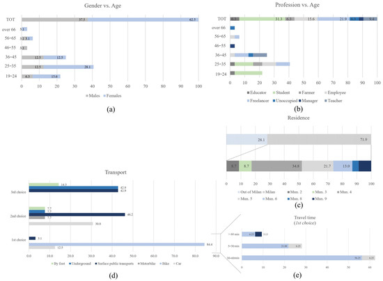 Sociographic properties analysis (Figure 6) returns a rather interesting picture: 62.5% females; 40.6% of total respondent are in the 25–35 age range, 25% are in the 36–45 age range (Figure 6a). In total, 71.9% live in Milan city (mainly, municipalities 4 (34.8%) and 5 (21.7%), which are the closest to the study area) (Figure 6c). Overall, 84.4% of surveyed people travel to the AF by bicycle as their first choice, and surface public transports (46.2%) and car (30.8%) prevails as their second choice, taking between 5 and 30 min in 62.5% of first choice cases (Figure 6d,e). Such data provide useful insights with respect to future attempts at monetary quantification. The level of education is high: master’s degree (43.8%), high school diploma (25%), bachelor’s degree (25%), postgraduate degree (12.5%), and PhD (3.1%). With respect to employment, there are many students (31.3%), freelancers (21.9%), employees (15.6%) and some teachers (9.4%) (Figure 6b).