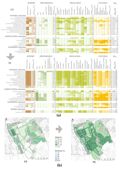 Figure 7a shows the potential ES matrix, in which we qualitatively assessed the contribution of each CS and TS land use category towards the provisioning of each ES type. It shows significant positive TS contribution (Figure 7a).