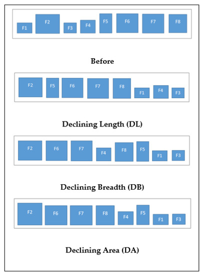 Figure 1 illustrated the different pre-processing stages with the exception of “none”, which had no fixed pre-processing. In situations where multiple facilities shared the same DL or DB values, a tiebreaker was used to determine their order. Similarly, in cases where some facilities shared the same area values, the breadth or length was used to break the tie. If the breadths or lengths were equal, the tie was broken arbitrarily.