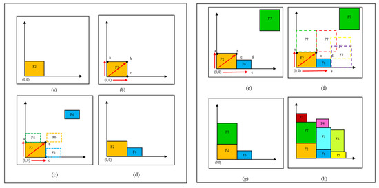 The processing stage of the study played an essential role in optimising the position of the study’s facilities within the manufacturing plant to achieve the study’s objectives. The primary procedures for developing the Origin heuristic were executed during this stage with the aim of minimising the MHC. Figure 2 presents all the procedures involved in the processing stage in a diagrammatic form, providing a clear visual representation of the steps taken. In Figure 2a illustrates the first facility is placed at the origin (0,0). Then, the shortest distance is calculated at each corner point of the first facility as shown in Figure 2b. Figure 2c is where the facility is tested at each corner point before placement, for example, reference point = (0,0), distance a = 5, distance b = 6.4, distance c = 5, shortest distance = Min {5, 6.4, 5} = 5, break tie arbitrarily. Then, choose the minimum distance and place the second facility as presented in Figure 2d. All the other facilities are placed by filling up the plane based on the shortest distance from the origin at the bottom-left corner as shown in Figure 2e–g. The finalised layout is shown in Figure 2h. Then, the calculation of the overall cost from their centroid after placement of all facilities. Algorithm 1 illustrates the step-by-step approach of the heuristic method, outlining the specific actions taken at each stage.