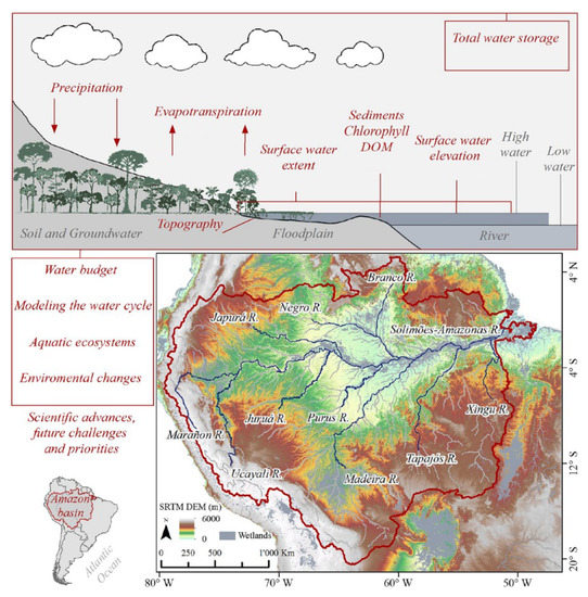 - Fassoni-Andrade, A.C.; Fleischmann, A.S.; Papa, F.; de Paiva, R.C.D.; Wongchuig, S.; Melack, J.M.; Moreira, A.A.; Paris, A.; Ruhoff, A.; Barbosa, C.; et al. Amazon Hydrology from Space: Scientific Advances and Future Challenges. Rev. Geophys. 2021, 59, e2020RG000728. [Google Scholar]