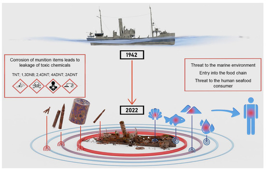 - Maser, E.; Bünning, T.H.; Brenner, M.; Van Haelst, S.; De Rijcke, M.; Müller, P.; Wichert, U.; Strehse, J.S. Warship Wrecks and Their Munition Cargos as a Threat to the Marine Environment and Humans: The V 1302 “JOHN MAHN” from World War II. Sci. Total Environ. 2023, 857, 159324. [Google Scholar] [CrossRef]