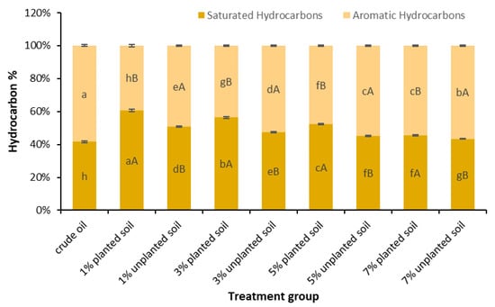 Changes in total saturated and total aromatic hydrocarbons extracted from Vinca rosea-planted soils treated with 1%, 3%, 5%, and 7% crude oil after a 5-month experimental period. Results are compared with the initial amounts of crude oil and the residual amounts of crude oil in the unplanted soils as controls. Different lowercase letters indicate significant differences in hydrocarbon percentages between different treatment levels in treated and untreated soils and including crude oil. Different uppercase letters indicate significant differences between the planted and unplanted soil at each crude oil treatment level at p < 0.05. Values are expressed as mean ± SE (n = 3).