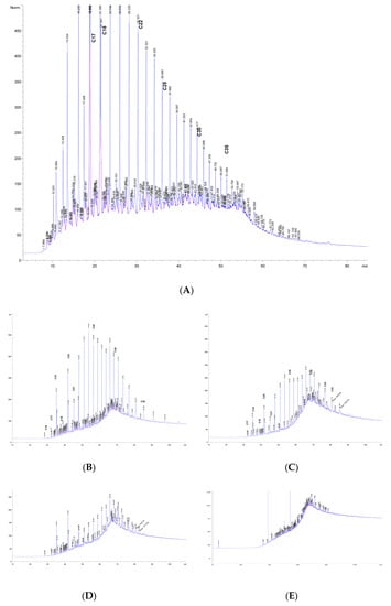 Chromatograms of saturated hydrocarbons extracted from crude oil (A), unplanted soil treated with 7% crude oil (B), Vinca rosea-planted soil treated with 7% crude oil (C), unplanted soil treated with 1% crude oil (D), and Vinca rosea-planted soil treated with 1% crude oil (E) after a 5-month experimental period.