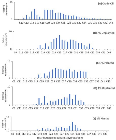 Relative abundance of n-paraffin compounds in the saturated hydrocarbon fractions after a 5-month experimental period extracted from (A) crude oil, (B) unplanted soil treated with 7% crude oil, (C) Vinca rosea-planted soil treated with 7% crude oil, (D) unplanted soil treated with 1% crude oil, and (E) Vinca rosea-planted soil treated with 1% crude oil.
