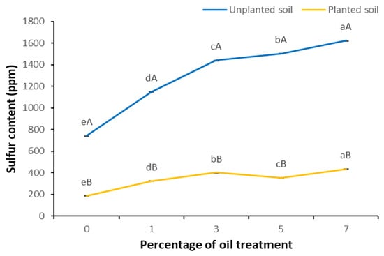 Sulfur content in soil planted with Vinca rosea and treated with 0%, 1%, 3%, 5%, and 7% of crude oil after a 5-month experimental period compared to unplanted soil with the same crude oil treatment levels. Different lowercase letters indicate significant differences between different treatments, and different uppercase letters indicate significant differences between the planted and unplanted treatments at each crude oil concentration at p < 0.05. Values are expressed as mean ± SE (n = 3).