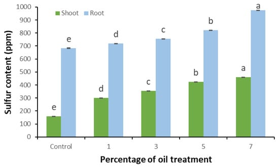 Sulfur content in shoots and roots of Vinca rosea plants raised under 0% (control), 1%, 3%, 5%, and 7% treatment levels after a 5-month experimental period. Different letters indicate significant differences between different treatments at p < 0.05. Values are expressed as mean ± SE (n = 3).
