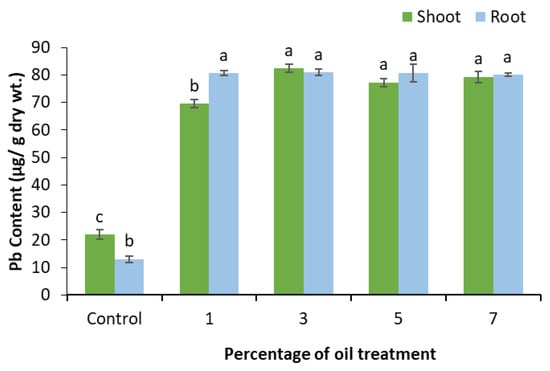 Lead content in shoots and roots of Vinca rosea plants raised under 0% (control), 1%, 3%, 5%, and 7% treatment levels after a 5-month experimental period. Different letters indicate significant differences between different treatment levels at p < 0.05. Values are expressed as mean ± SE (n = 3).