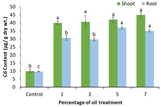 Cadmium content in shoots and roots of Vinca rosea plants raised under 0% (control), 1%, 3%, 5%, and 7% crude oil treatment levels after a 5-month experimental period. Different letters indicate significant differences between different treatments at p < 0.05. Values are expressed as mean ± SE (n = 3).