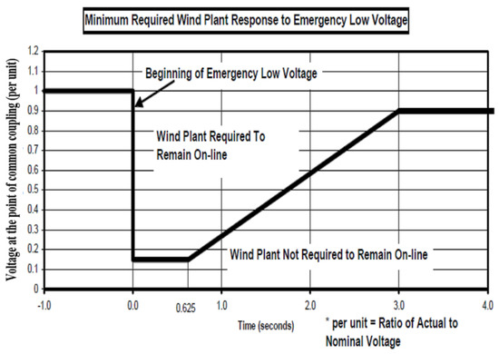 Once the voltage falls to a specific range at the point of common coupling (PCC) because of power system failures or disturbances, LVRT WT can operate continuously while holding its grid connection [3]. The WT’s LVRT capability ensures a balanced power system and maintains a stable frequency during and after disturbances. If WTs are not equipped with LVRT capability, if a fault subsists on the grid, WTs may trip [6]. Figure 1 demonstrates the necessities for LVRT in the United States. The WTGs should guarantee unremitting working without disconnection for 0.625 s when the PCC voltage drops to 15% of the rated voltage. When the PCC voltage recovers up to 90% of its rated voltage within 3 s following a voltage drop, generators should be able to provide continuous service without disconnection [3].