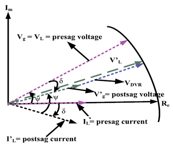 where Vg is the grid voltage, is the difference phase angle between load voltage and load current phasors, VL is the load voltage and IL load current prior sag, V’g is the grid voltage, V’L is the load voltage and I’L load current after sag, VDVR is the DVR compensation voltage [11].