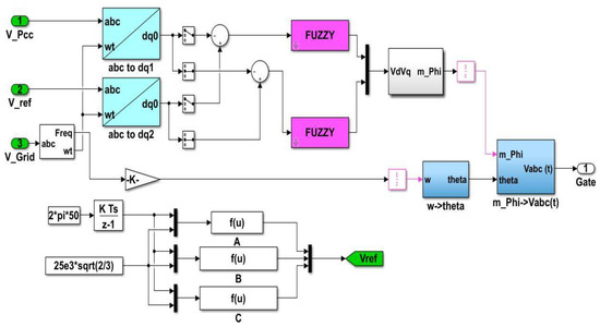 The detection of the beginning and conclusion of a failure case, the creation of references, the regulation of the injected voltage, both in temporary and permanent states, and the safeguarding of the equipment are encompassed within the control of DVR. The grid-side pre-sag voltage before DVR is used to estimate the voltage decrease during the fault in the feed-forward control. The feedback control monitors the SRG side’s voltage mitigation after DVR. Converter protection is controlled by the voltage of the DC link [29]. This combined control provides feedback that takes the filter-induction voltage drop and transformer into account [30,31]. The Matlab/Simulink platform of the DVR controller is presented in Figure 6.