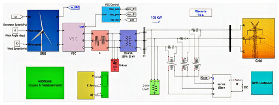 Simulation outcomes under LVRT by DVR are deliberated. The obtainable on the MATLAB/SIMULINK system, DVR is investigated to enhance various fault conditions for the power system illustrated in Figure 8 to control the SRG’s voltage driven by WT. The intended DVR has a power of 0.5 MVA coupled to 25 kV distribution network.