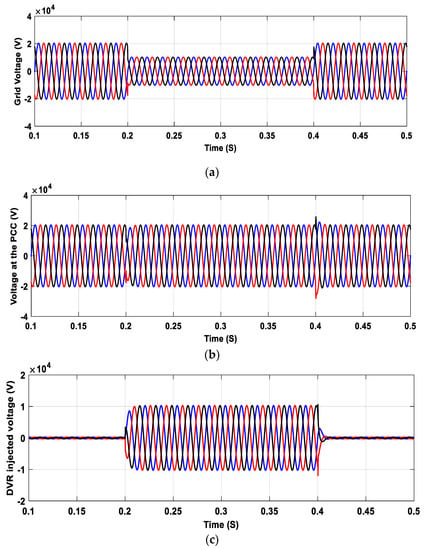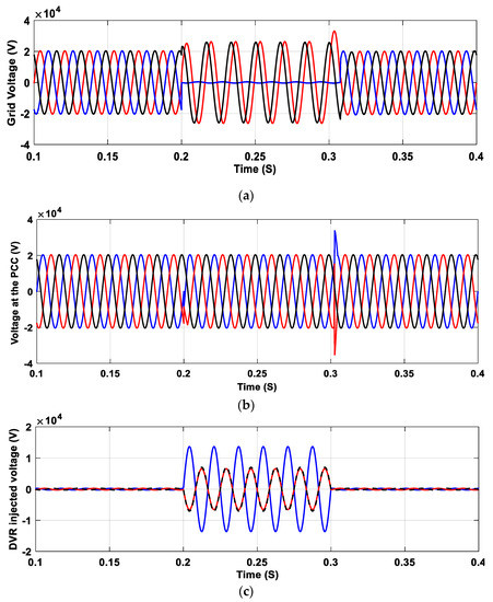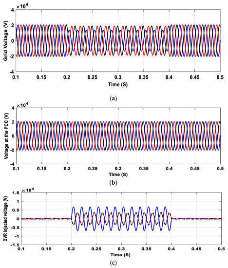 The voltage sag is the most common type of grid disturbance due to sudden switching on large inductive loads, similar to starting the motor of an electrical heater. In this case, the symmetrical voltage sag of 50% is made in the side of the grid at t = 0.2 s to 0.4 s. A similar voltage sag is produced when attaching the DVR to the PCC; the necessary compensation voltage is injected by the DVR, which is then controlled to maintain the stator terminal voltages of the SRG at the proper magnitude. The balanced sag voltage on the grid side is displayed in volts in Figure 9a. The voltage at PCC is displayed in volts in Figure 9b,c displays the voltage injected by DVR in (V).