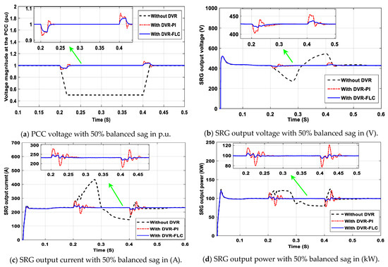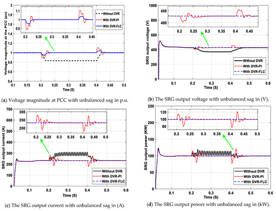To simulate and compare transient behaviors of the SRG in the sag mode, both FLC and PI controller control systems based on DVR-based series compensation are used. In this sag mode, the responses of the system under study are depicted in Figure 10. As shown in Figure 10a, the PCC voltage is adjusted to 1 p.u. through a slight overshoot. It is also found that by using DVR with FLC, the overshoot and oscillation can be reduced more effectively than with a PI controller. Figure 10b depicts the SRG’s output voltage in volts. After 1 cycle of oscillations, or roughly 0.016 s, a minor overshoot occurs before the voltage reaches a steady state. Figure 10c,d display the current and power delivered to the grid by SRG. These figures demonstrate the significant oscillations that occurred during the sag disturbance period without the DVR. Additionally, utilizing DVR with FLC, it is demonstrable that the current or power exhibits slight overshoots and oscillations for 0.04 s (2.5 cycles), after which it is totally damped. According to the simulation’s findings, the SRG wind turbine is successfully shielded against transient voltages and currents by the FLC-based DVR-based series compensation.