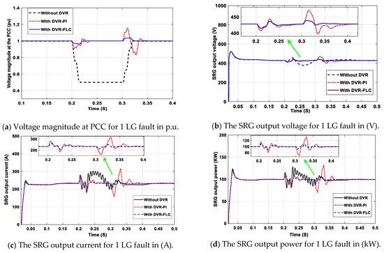 At t = 0.2 s for 0.1 s (6 cycles at 60 HZ), a 1 LG occurs at the grid side during phase A. When the same fault occurs when the DVR is connected at the PCC, the suitable amount of voltage is delivered into all three phases by the DVR, resulting in an improved voltage profile at the PCC. Figure 13a displays the grid voltage in (V) with a 1 LG fault. The PCC voltage after compensation in (V) is shown in Figure 13b and the injection voltage of DVR in (V) in Figure 13c. The examined SRG wind turbine’s transient behaviors with DVR-based series compensation under a 1 LG fault are simulated and contrasted using the control strategies FLC and PI controller, respectively.