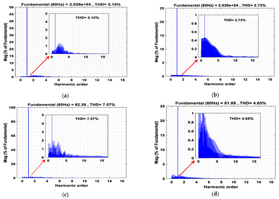 Voltage and current at the PCC bus using FFT: (a) THDv at VPCC with DVR-PI during sag mode, (b) THDv at VPCC with DVR-FLC during sag mode, (c) THDi with DVR-PI during sag mode, (d) THDi with DVR-FLC during sag mode.