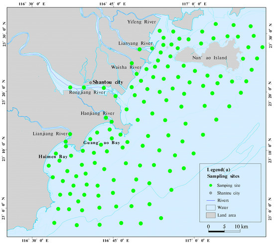 In 2020–2021, the Haikou Marine Geological Center conducted surface sediment sampling in the nearshore waters of eastern Guangdong. The sampling stations were set up uniformly according to the specifications (Figure 1). The surface sediment samples were collected using a clamshell sampler and sealed on-site for transportation to the laboratory. Surface samples of 0–1 cm were taken for grain size analysis. For samples with particle size < 2000 μm, a laser particle size analyzer (such as Malvern Mastersizer) was directly used for testing. The sample was uniformly mixed and approximately 2 g of dry sample was taken, diluted with water and 20 mL of sodium hexametaphosphate solution with a concentration of 0.5 mol/L was added. After 24 h of settling for full dispersion, the sample was tested using the analyzer. Testing was performed at 1/4φ intervals. To ensure accuracy, each sample was tested three times, and the average of the three results was taken. For samples with particle size > 2000 μm, they were first weighed, and then wet sieving was conducted using a sieve with a 1 mm aperture. The fine particles were analyzed using a laser particle size analyzer, while the coarse particles were analyzed using the traditional sieving method. The data from both parts were combined using a simulation program of the grain size analyzer to obtain the complete grain size distribution. The grain size classification followed the phi (φ) scale developed by Udden–Wentworth. The grain size parameters were calculated using the Folk–Ward equation [25]. Finally, the sediment was classified according to the Folk triangle graphic method specified in the “Specifications for Oceanographic Surveys” (GB/T12763-2007) [26].