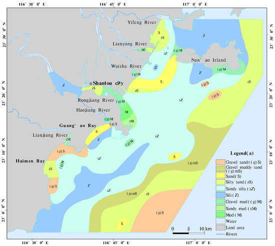 The sediment types in the study area mainly include gravel sand ((g)S), gravel muddy sand ((g)mS), gravelly mud ((g)M), sand (S), silty sand (zS), sandy silt (sZ) and silt (Z), and a small amount of sandy mud (sM) and mud (M). The grain size characteristics of each sediment type are shown in Table 1, and the distribution of sediment types is shown in Figure 2. The pebbled sand is mainly distributed in Haimen Bay and the southeast corner of the study area, indicating a strong hydrodynamic force in this area, with an average gravel content of 11.06% and an average sand content of 84.45%. The gravel muddy sand is mainly distributed in the area of 20–25 m water depth in the southeast corner of the study area, mainly composed of sand, with an average content of 64.48%. The sand is mainly distributed in the Houjiang waterway’s outer sand estuary, Guang’ao Bay, and sporadically in Liuhewei and part of the southeast corner. All of them belong to an area with strong hydrodynamic force and more frequent wave scouring. The main component is sand with an average content of 98.90%, and the overall sorting is good. The silty sand is mainly distributed in the E-SE side of Nan’ao Island, the estuary of the Lianyang River, the estuary of Xinjin Creek, the middle section of the Rongjiang River, and part of the southeast corner of the study area. It is distributed in a banded NE direction, and its hydrodynamic force is weaker than that of sand. Its main component is sand, with an average content of 66.05%. The sandy silt and silt account for the largest proportion of 54.42%, mainly distributed in most of the near-shore sea areas on the northern side of Nan’ao Island, the seashore of the mouth of the Rongjiang River, and Jinghai Bay. They are distributed in continuous sheets in the direction of NE–SW and are basically within 20 km from the shoreline with weak hydrodynamic force. These areas are also where a large amount of river sediment is deposited, the main component of which is silt, with an average content of 66.95%. The gravelly mud is mainly distributed at the mouth of Rong River, Outer Sand River and Hao River, and the southeast side of Nan’ao Island and Guang’ao Bay, indicating that the hydrodynamic force in this area is weak, and the main component is powder sand, with an average content of 57.77%. The sandy mud and mud are mainly distributed at the estuary of Lianjiang River, the estuary of Lianyang River and the area near the sand barrage at the outlet of Rongjiang River. The main component is silt with an average content of 52.53%, which indicates that the hydrodynamic force in these areas is weak, especially at the outlet of Rongjiang River. Because of the action of the sand bar, the wave and tide action are weakened, and the fine sediment of the river accumulates here.