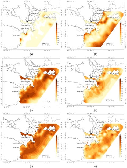 According to the distribution characteristics of the sand content contour (Figure 3b), the sand content in the area varies greatly. The high-value area is mainly distributed in Houjiang waterway (outer sand estuary), Guang’ao Bay, Haimen Bay and the area above 20 km from the shoreline, with a gradually increasing trend from northwest to southeast. The low-value area is mainly striped from Nan’ao Island—the mouth of Rongjiang River—to Jinghai Bay, with sand content basically less than 20%. The area above 20 km from the shoreline is mainly sandy because river sediment cannot reach here. The low-value area is mostly distributed in the estuary outlet and near-shore area, indicating that river sediment is mainly deposited in this area.