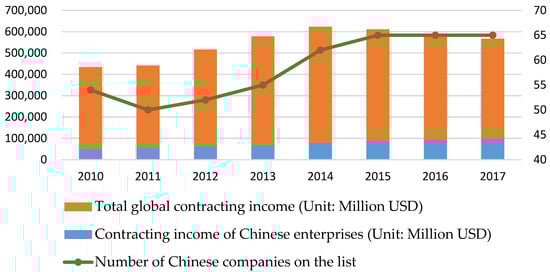 Considering that international investment is of great significance to infrastructure construction in developing countries or regions, China has actively fulfilled its responsibilities as a major country and has contributed its own strength to its infrastructure development. In “the Belt and Road Initiative” proposed by China in 2013, infrastructure connectivity was set as a priority [14,15,16]. The establishment of two major multilateral financial institutions under the Belt and Road Initiative, the Asian Infrastructure Investment Bank and the Silk Road Fund, aims to provide financial support and to enhance cross-border investment in countries. Investment and social capital from financial institutions can provide financial support for overseas infrastructure projects contracted by Chinese engineering enterprises, such as build-operate-transfer (BOT) projects, public–private partnership (PPP) projects, and finance–design–procurement-construction (F-EPC) projects [1]. A total of 65 Chinese Engineering enterprises entered the Engineering News-Record (ENR) Top 250 list of international contractors in 2017, as shown in Figure 1.