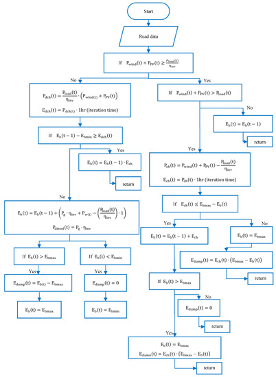 If all the components of the HMS are in close vicinity of the power consumption, then it can be considered that minimal electrical losses will be associated with the distribution of power. The goal of the EMS in the proposed HMS is to implement a management strategy to provide optimal power sharing between all the elements of the HMS. The management strategy to be implemented by the EMS is highlighted in the flowchart shown in Figure 2 [30]. According to this strategy, power generated by the RES (PV plant, wind plant) will be utilized on a priority basis to satisfy the load demand. After meeting the load demands, any excess energy available from these renewable plants will be used in charging the battery units. In case the load demand is higher than the combined power produced by the RES, the EMS will try to fulfil the remaining demand through the battery bank. In an extreme scenario, when all the elements connected with the DC bus fail to meet the load requirements, the diesel generator will be operated to overcome the shortage of power. If any surplus energy is available from the diesel generator, it will be utilized in recharging the battery bank for future requirements. In Figure 2, and denote the energy of the battery at the current time instant and the previous time instant, respectively. stands for charging energy of the battery and denotes its discharging energy The excess energy that is dumped at the current time instant is represented by . and , respectively, denote the minimum and maximum storage capacities of the battery. The equations in the preceding sections contain the rest of the symbols and their corresponding explanation.