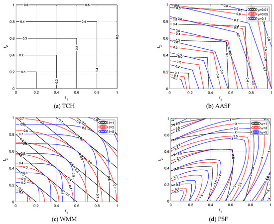 The augmented achieving scalarizing function (AASF) [46] was introduced to tweak the opening angle of the contour lines, as shown in Figure 3b. The function is given as
