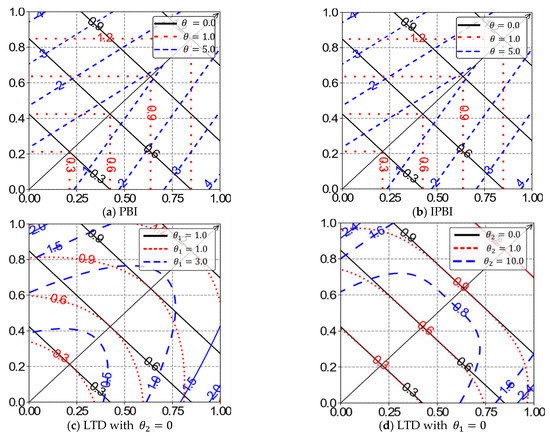 For the TCH-based methods, the shape of the contour line primarily depends on the distance measured with reference to the ideal point. The Tchebycheff distance used in the original TCH method leads to contour lines like the Pareto dominance relation for identifying better solutions [46] and cannot distinguish weakly dominated solutions. To address the issues associated with the TCH approach for subproblem formulation based on the shape of the contour lines and to improve the regions that define solutions, various modifications to the traditional TCH have been proposed over the years. Each of these variants, discussed next, tweaks the contour lines to achieve some improvements by adapting the weighted metric parameter. The contour lines for the different variants of TCH are shown in Figure 3.