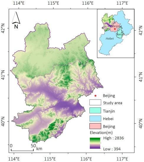 ZJK is geographically situated in the northwestern region of Hebei Province, China, between the longitude 113°50′~116°30′ E and latitude 39°30′~42°10′ N (Figure 1), covering an area of 36,965 km2. It is located at the junction of the Inner Mongolia Plateau and the North China Plain, with high elevation in the northwest and low elevation in the southeast [28]. Based on the topographical transition zone between the plateau and the plain, ZJK could be divided into two distinctive natural regions: North Zhangjiakou (NZJK) and South Zhangjiakou (SZJK). The NZJK is arid with an average annual precipitation ranging from 277 to 496 mm, and its primary vegetation types are cropland and grassland. Meanwhile, the NZJK area experiences an annual average air temperature of between 1 °C and 3 °C. In contrast, SZJK receives abundant precipitation compared to NZJK, with an average annual precipitation between 408 to 651 mm, and an annual average air temperature ranging from 6 and 8 °C, and its primary vegetation types are forest and cropland. Generally, ZJK has a total precipitation of 17.21 billion m3, while with the total water resources stand at 1.52 billion m3, according to Hebei’s 2020 Water Resources Bulletin. While both Beijing and ZJK, located within the Haihe River basin, share the same ecological boundary and face significant water scarcity challenges, ZJK plays a crucial role in providing water conservation and ecological support to Beijing. Therefore, the assessment of water yield and water conservation capacity of ZJK is crucial for its conservation efforts and supporting Beijing’s ecological environment [11].