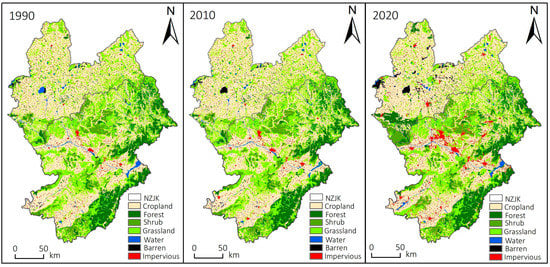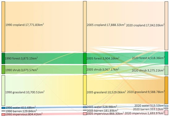 Land use types in ZJK were generally divided into seven categories, including cropland, forest, shrub, grassland, water, barren, and impervious (Figure 2). Different land use types in ZJK changed and transformed significantly from 1990 to 2020 (Figure 2, Figure 3 and Figure 4). Overall, cropland covers the largest area from 1990 to 2020, while water occupy relative smaller area compared with other land use types. However, the area of cropland and grassland decreased while the area of forest and impervious increased in ZJK from 1990 to 2020. The area of cropland decreased by 729.80 km2, the area of grassland decreased by 1111.73 km2, and the area of water decreased by 98.15 km2 from 1990 to 2020, respectively. However, the forest area increased by 645.21 km2, the shrub area increased by 201.64 km2, the impervious increased significantly by 889.56 km2, and the area of barren increased by 203.28 km2 during this period, respectively.