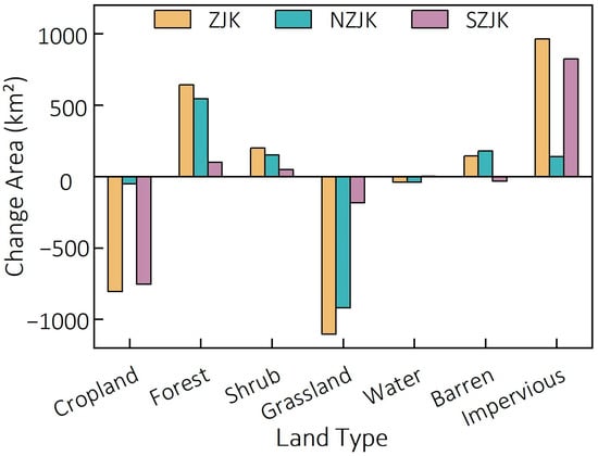 Generally, the changes in land use in the north and south of ZJK are generally consistent but with little different. Forest, shrub, barren and impervious in the NZJK are significantly increased, with an increase of 546.83 km2, 151.72 km2, 237.23 km2, and 141.04 km2, respectively; while the area of grassland, cropland and water were decreased, with a decrease of 926.37 km2, 51.37 km2, and 99.30 km2, respectively. Moreover, forest, shrub, impervious and water in SZJK are increased, with an increase of 98.31 km2, 49.76 km2, 748.90 km2, and 1.15 km2, respectively; while the area of cropland, grassland, and barren decreased by 679.00 km2, 184.86 km2, and 33.79 km2, respectively (Figure 3).