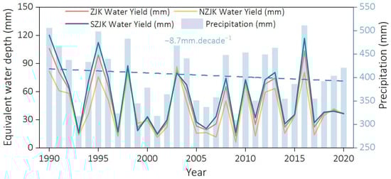 Changes in water yield in Zhangjiakou (ZJK), North Zhangjiakou (NZJK), and South Zhangjiakou (SZJK) from 1990 to 2020.