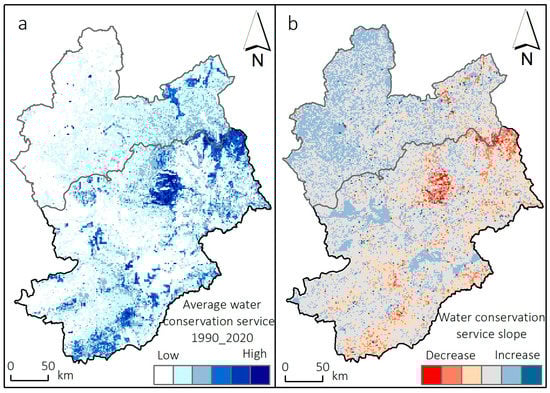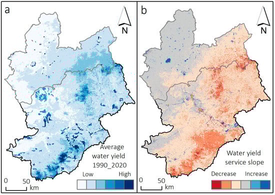 Average water yield service (a) and slope (b) from 1990 to 2020.
