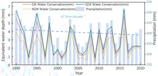 Changes in water conservation in Zhangjiakou (ZJK), North Zhangjiakou (NZJK) and South Zhangjiakou (SZJK) from 1990 to 2020.