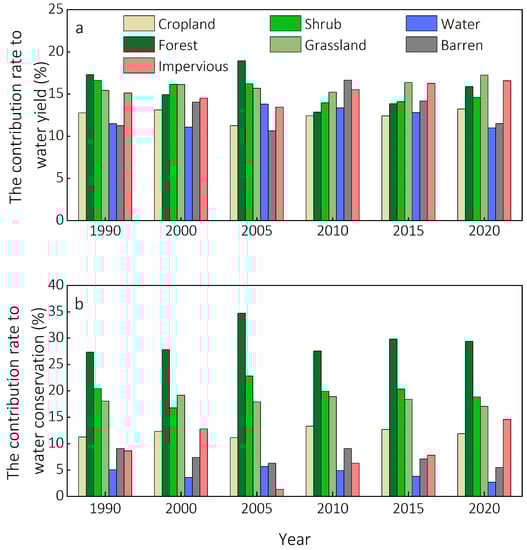 Different land use type contribution rate to water yield (a) and water conservation (b).