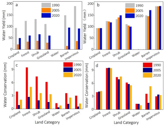 Under the scenarios of constant land use and changing precipitation (Figure 10a,c), the average water yield depths in 2005 and 2020 for S4 are 26.55 mm and 56.26 mm, which are 79.58 mm and 49.87 mm lower than the real situation in 1990, and the total water yield are 2.94 billion m3 and 1.84 billion m3, respectively. The average depth of water yield of each category changes obviously and shows a decreasing trend, which is consistent with the regularity of precipitation; the depth of water conservation in 2005 and 2020 are 1.39 mm and 2.96 mm, which are reduced by 4.16 mm and 2.59 mm, respectively, compared with the real situation in 1990, and the total water conservation is reduced by 0.15 billion m3 and 0.10 billion m3, respectively. The simulation results show that when the land use cover is kept constant and the precipitation changes, the water yield and water conservation change significantly.