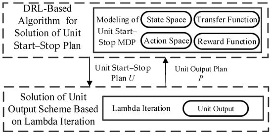 In this paper, DRL is applied to the field of UC decisions [], and an intelligent algorithm for solving UC based on DRL is proposed. The UC problem is calculated in two steps, and the decision block diagram is shown in Figure 1.