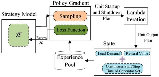 The first step is to decide the current unit start–stop scheme based on DRL. The second step is to solve the economic dispatching problem based on Lambda iteration according to the start–stop scheme of the unit at the current time. In the first step, the DRL algorithm is used to establish the MDP model of the UC problem. Based on the characteristics of the UC problem, the state space, action space, transfer function and reward function are given, the PG algorithm is used to solve the problem, and the optimal unit action mode at the current time is obtained. In the second step, Lambda iteration is adopted to solve the economic dispatching problem according to the unit start–stop mode obtained in the first step, and the specific output value of the unit at that moment is obtained. Therefore, the system operation cost at the current moment is obtained accordingly.