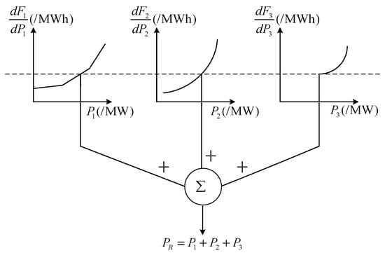 It is assumed that there is a system with three generating units, and it is hoped that the optimal economic operation point can be found. One way to carry this out is to characterize the incremental cost characteristics of each unit by plotting the incremental cost characteristics of the three units on the same graph, as shown in Figure 4.