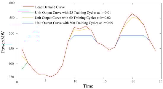 It can be seen from Figure 11 and Figure 12 that when the number of iterations is 300, there is a power shortage during part of the peak hours from 9 to 24. When the number of iterations is set to 500, the system unit output can meet the load demand at any time in the scheduling period, and there is no power shortage. Therefore, the DRL-based intelligent UC algorithm proposed in this paper is correct and effective in the decision-making of small-scale UC problems.