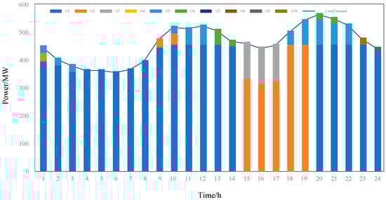 By selecting the optimal unit start–stop scheme, , to minimize the operation cost of the system, the following results are obtained: