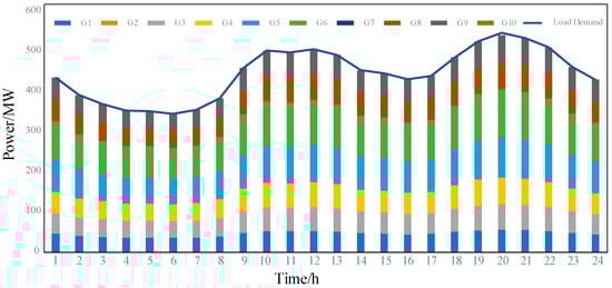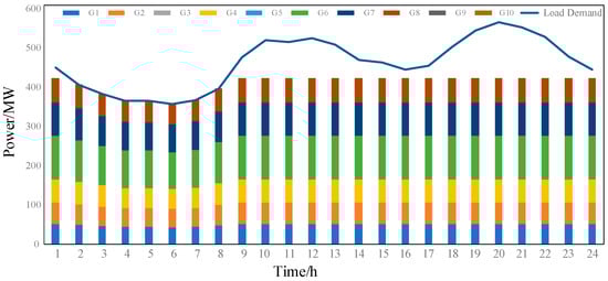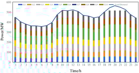 Before the transition into the new state, the unit start–stop scheme, , obtained using the solution is taken as the start–stop action of the unit in 24 h in the economic dispatching problem. According to the action, Lambda iteration is used to solve the problem, and the actual output power, , of the unit in the startup state is given.