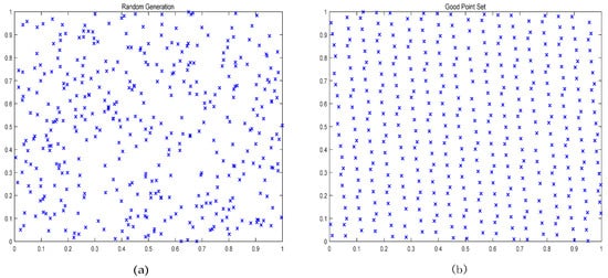 Compared to the random method’s initial population distribution, the populations initialized with good point sets exhibit a more uniform distribution. The distribution of the initial population in the search space is a crucial factor that determines the algorithm’s global search ability. The more evenly the population distribution is, the higher the population diversity is and the stronger the global search ability of the algorithm is. So using the good point set method to initialize the population can improve the algorithm’s stability. Figure 1 illustrates the population distribution for random initialization (a) and good point set initialization (b).