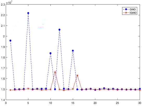 The experimental results of using IGWO and GWO solved 30 times are shown in Table 6, Figure 3 and Figure 4.
