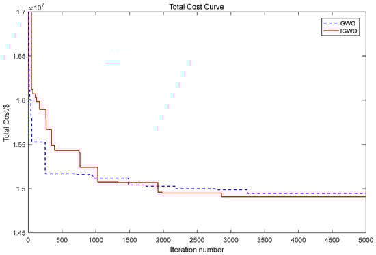 The trend of the minimum total cost obtained from GWO and IGWO solving.