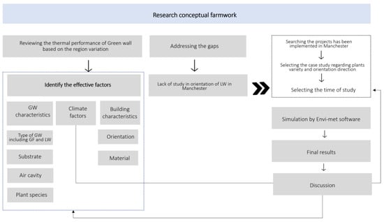 Few studies have analyzed the thermal performance of LWs, specifically in Manchester’s climate and urban conditions. The study’s novelty is the LW simulation carried out on the building prototype in the extreme weather in Manchester, which is implemented in the northwest and southeast directions, and is covered with seven plants already used by local GW companies. The results of this research can assist companies, designers, and consumers to determine the efficiency of LWs and optimum LW orientations in Manchester’s climate conditions. The limitation of this study is that this study used particular LWs in Manchester as the case study. The LWs include seven different types of plants with mixed effects on air quality, thermal performance, and appearances in various seasons. Therefore, the calculated results for the effects of the LWs are closely related to the plants used and the location and orientation of the LWs.