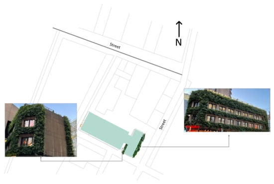 This research uses a multistory building in the city center of Manchester as a stereotype building for the simulation, and this section of the city in which the building is located is densely populated, and the southeast side of the GW faces a busy street. The materials used in the construction are diverse; however, the outside walls are a combination of concrete cladding and glass, as shown in Figure 2. The modular LW elements are secured by a porous vertical carrier rail to support the weight of the soil and plants. The applied substrate is clay. The LW is colorful in appearance and comprises evergreen and flowering plant species for year-round attraction. Some plant species also have significant air purification properties, which are helpful because the building is situated in a relatively busy urban area. The plan of the building and its orientation are illustrated in Figure 2. The simulation used a standard building envelope wall of concrete and rainscreen concrete cladding. The case chosen represents a typical example of LWs in a busy urban area that are surrounded by other buildings and busy streets.