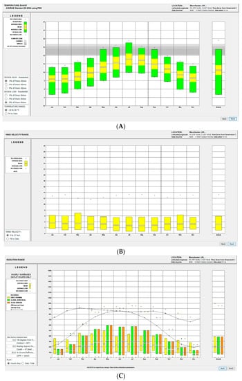 (A) Temperature range, (B) wind velocity range, and (C) radiation range charts for Manchester (Climate Consultant software outputs).