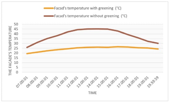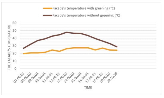 Compared to the baseline scenario (façade without greening), the LW had a cooling impact on the façade (Figure 5). Effectively, the cooling performance of the LW indicated a temperature decrease of almost 6.91 °C at 7 a.m. and 11.37 °C at 8.00 a.m., followed by a steady increase of 17.80 °C, 18.77 °C, and 18.39 °C between 9 and 11 a.m. The temperature difference increased dramatically between 1.00 p.m. and 2.00 p.m., reaching 23.48 °C, followed by 19.01 °C at 3.00 p.m. and 16.08 °C at 4.00 p.m. After 6.00 p.m., the surface temperature decreased by 9.27 °C, and the difference between 7.00 and 8.00 p.m. was 9.74 °C and 5.43 °C, respectively. On a hot summer day in July 2022, the reduction in façade temperature ranged from 5.43 °C to 23.48 °C. On average, the results confirm that the LW cooled down the façade by 15.00 °C.