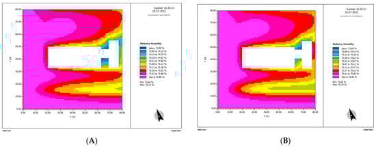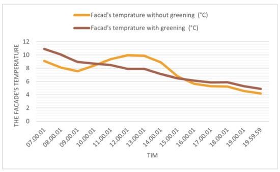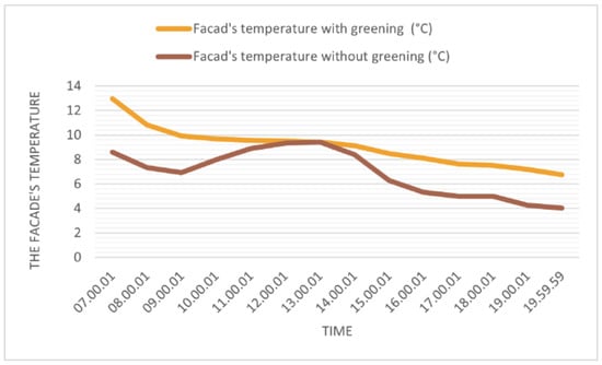 The southeast façade with greening was approximately 4.38 °C, 3.49 °C, and 3.00 °C warmer than the façade without greening, as demonstrated (Figure 6) from 7 a.m. to 10 a.m. on a cold day on 7 January, when the LW was simulated. The least effective times for the LW to slightly warm the façade was at 11:00 a.m. and 12:00 noon, at about 0.66 °C and 0.81 °C, respectively. The surface temperature with and without plant cover was roughly equal at 1:00 p.m. The LW was, on average, 2.63 °C warmer from 1.00 p.m. to 8.00 p.m. It can be stated that the LW was warmer than a bare wall on a freezing winter day in 2022, by, on average, about 2.18 °C. However, its efficiency on a scorching summer day was significantly more profitable.